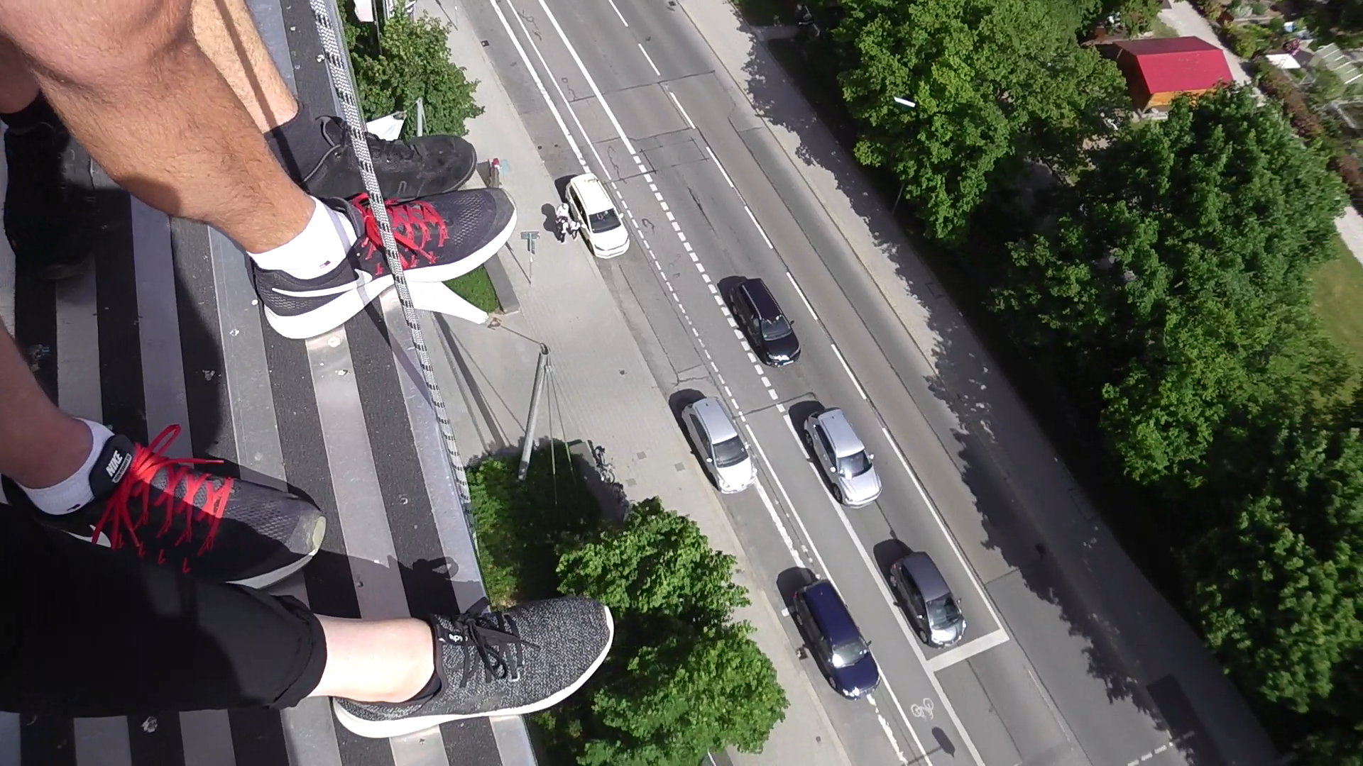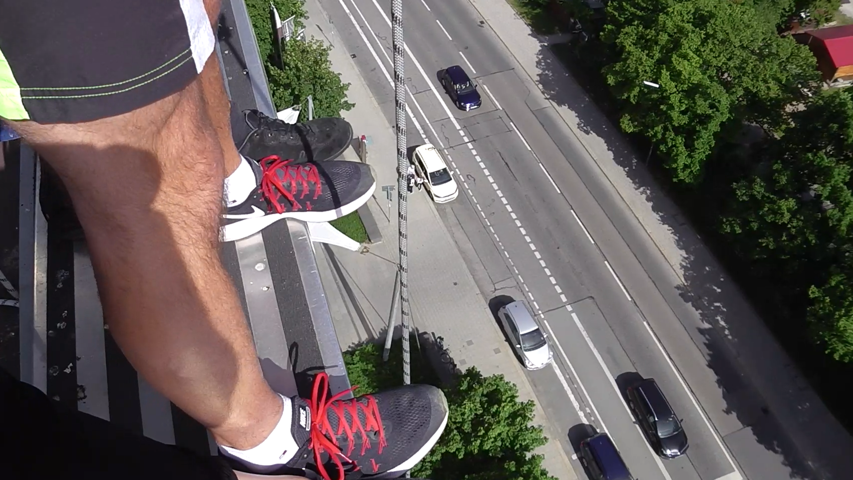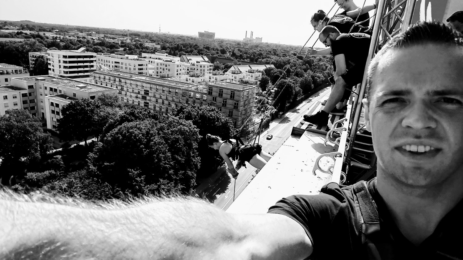 Dokładnie przy tym wyjściu na dach leżał martwy ptak. Znajoma rzuciła „Mam nadzieję, że to nie zły fatum” i zrobiło się poważniej. Bo co innego wjeżdżać sobie na dachy czy tarasy widokowe, obejrzeć widoki i co najwyżej zrobić kilka zdjęć. Co innego, być tam z myślą, że masz o sile własnych mięśni z nich zejść! Zwłaszcza że nigdy nie wisiałem na żadnej ścianie i nie miałem nic wspólnego ze wspinaczkami.