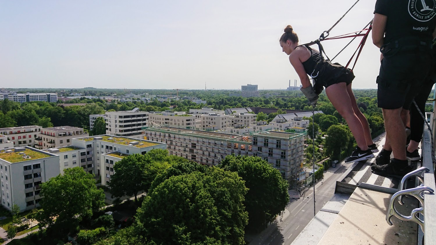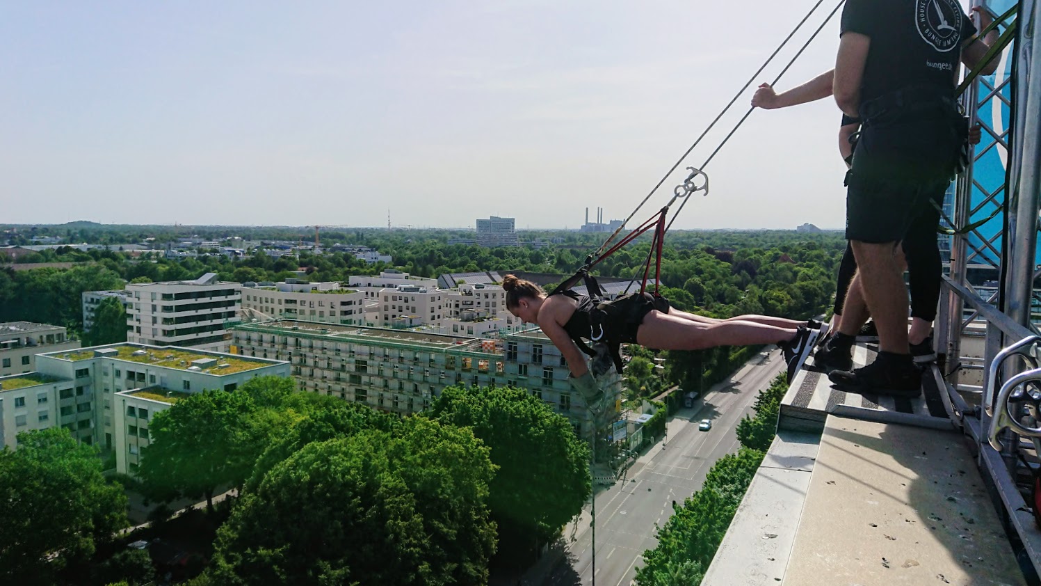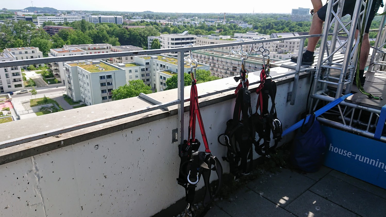 Posiłkując się wiedzą z oficjalnej strony organizatora, kilka lat temu, w 2012 roku, grupa wspinaczkowych zapaleńców wpadła na pomysł i dogadała się z właścicielem hotelu Rilano 24|7 w Monachium. Na sezon letni postanowili zabudowywać dach tego 12 piętrowego hotelu dodatkową konstrukcją. Konstrukcja – aluminiowa rama, umożliwia bezpieczny transport wszystkich zainteresowanych z góry na dół. Może nie do końca transport, ponieważ trzeba zejść samemu i nie ma to nic wspólnego z wygodą i poczuciem bezpieczeństwa (wiem że goście hotelu mają ofertę specjalną). W każdym razie na dachu poza wentylatorami znajdują się liny, uprzęże, pasy i wszystko, co do tego potrzebne. Był również sprzęt audio, z którego grała muzyka, gdy tylko skończyła się instrukcja obsługi liny.