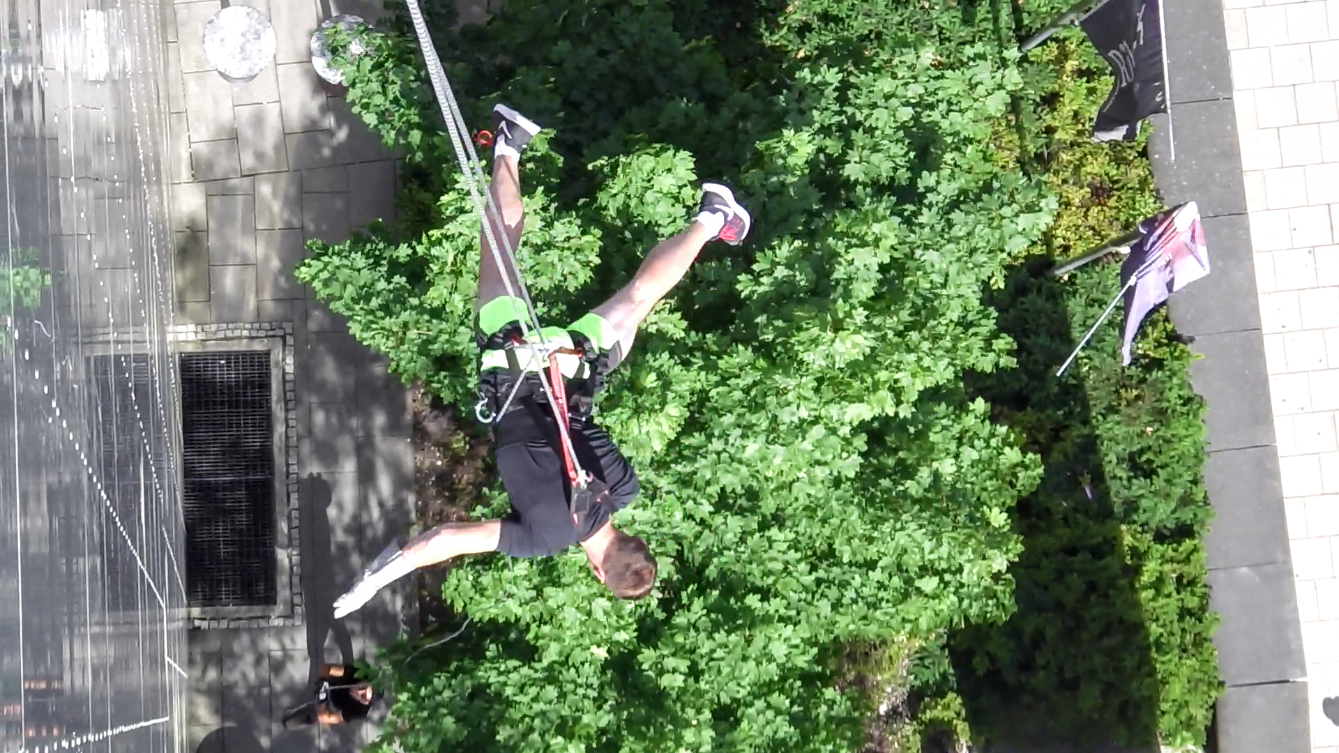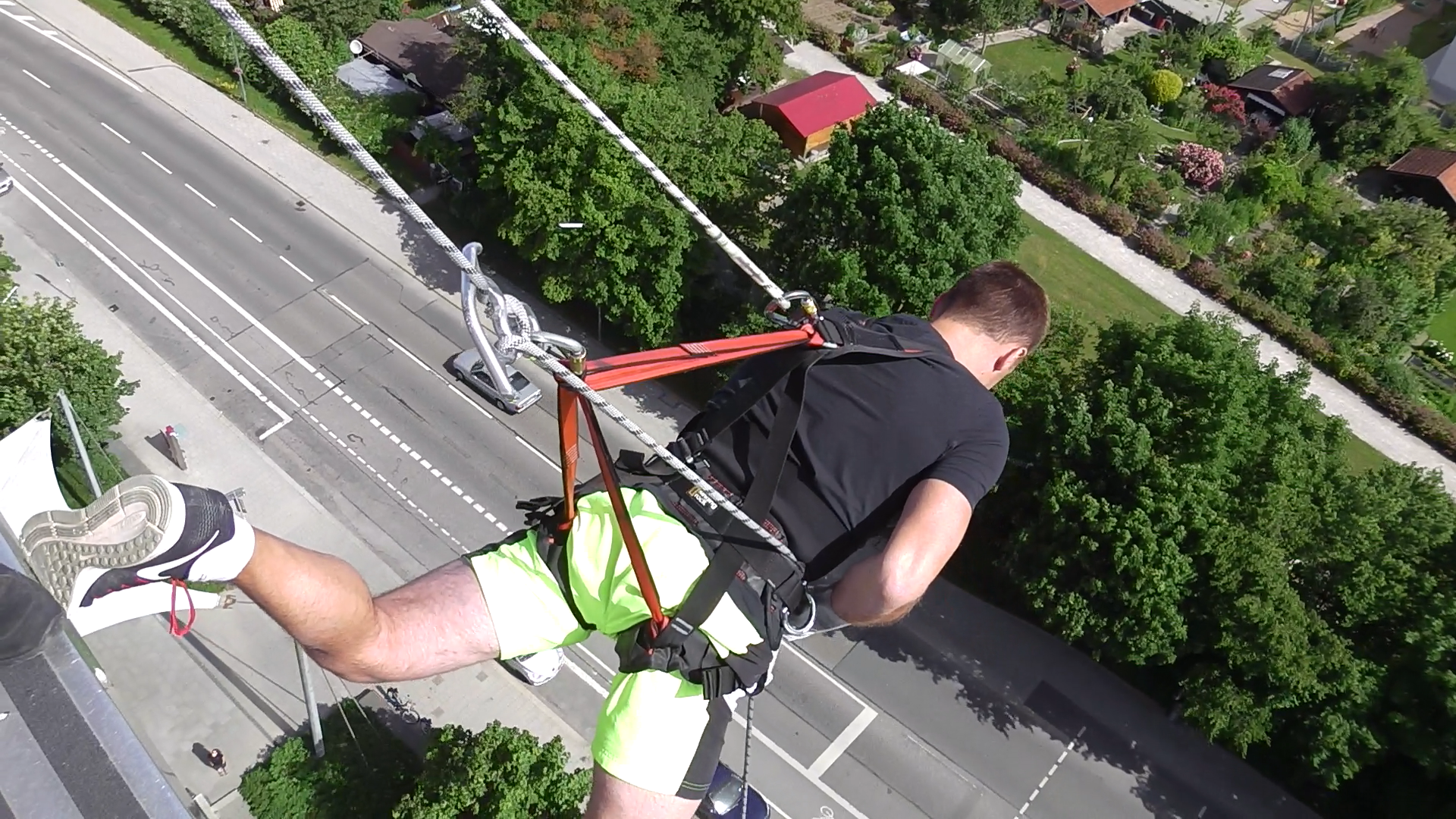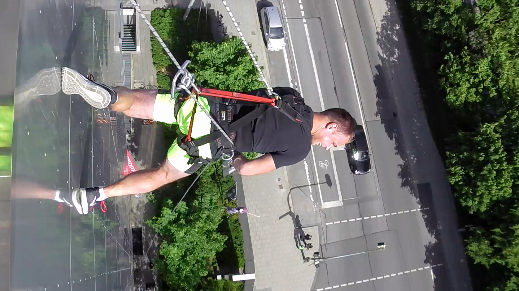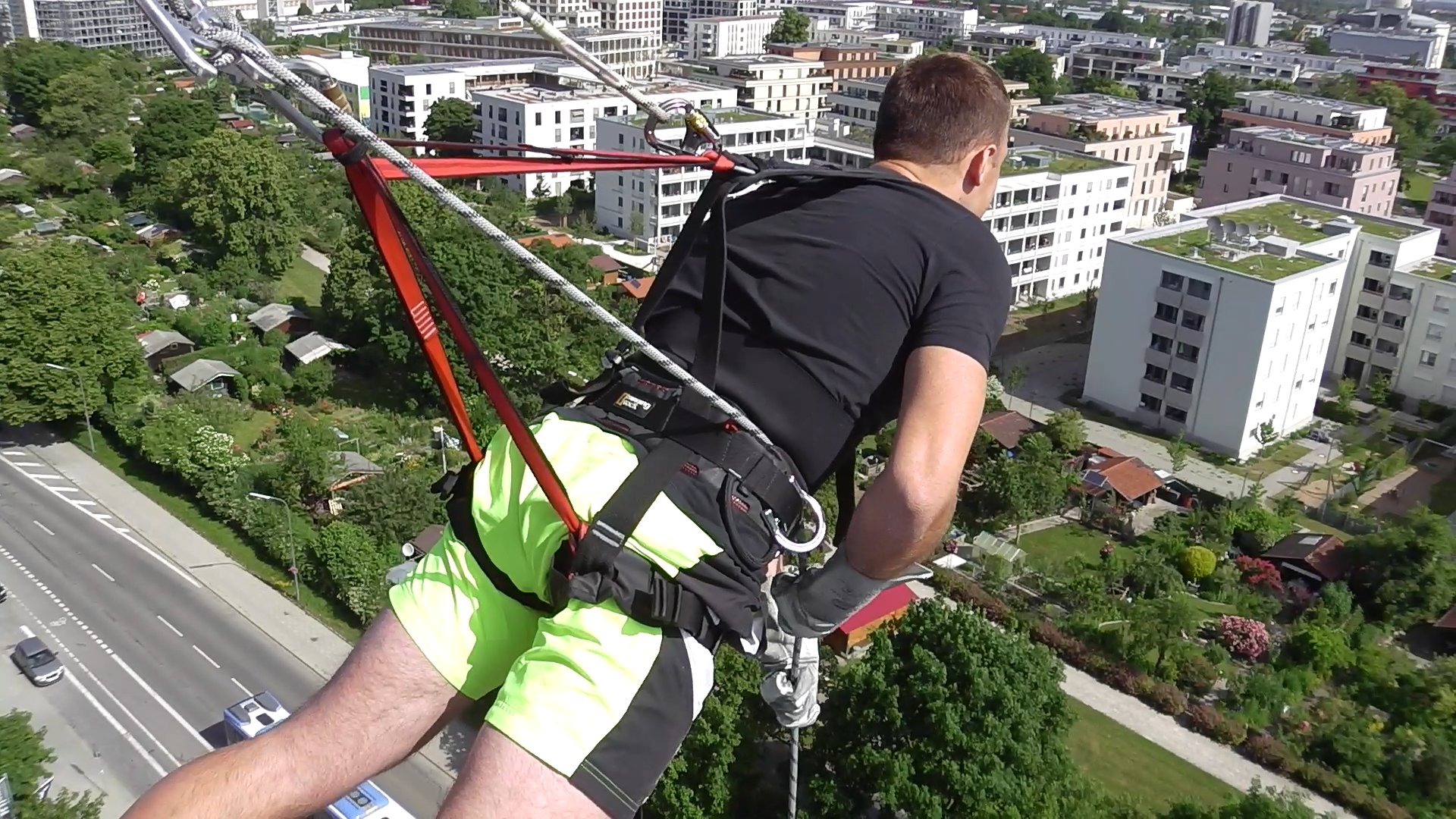 Posiłkując się wiedzą z oficjalnej strony organizatora, kilka lat temu, w 2012 roku, grupa wspinaczkowych zapaleńców wpadła na pomysł i dogadała się z właścicielem hotelu Rilano 24|7 w Monachium. Na sezon letni postanowili zabudowywać dach tego 12 piętrowego hotelu dodatkową konstrukcją. Konstrukcja – aluminiowa rama, umożliwia bezpieczny transport wszystkich zainteresowanych z góry na dół. Może nie do końca transport, ponieważ trzeba zejść samemu i nie ma to nic wspólnego z wygodą i poczuciem bezpieczeństwa (wiem że goście hotelu mają ofertę specjalną). W każdym razie na dachu poza wentylatorami znajdują się liny, uprzęże, pasy i wszystko, co do tego potrzebne. Był również sprzęt audio, z którego grała muzyka, gdy tylko skończyła się instrukcja obsługi liny.