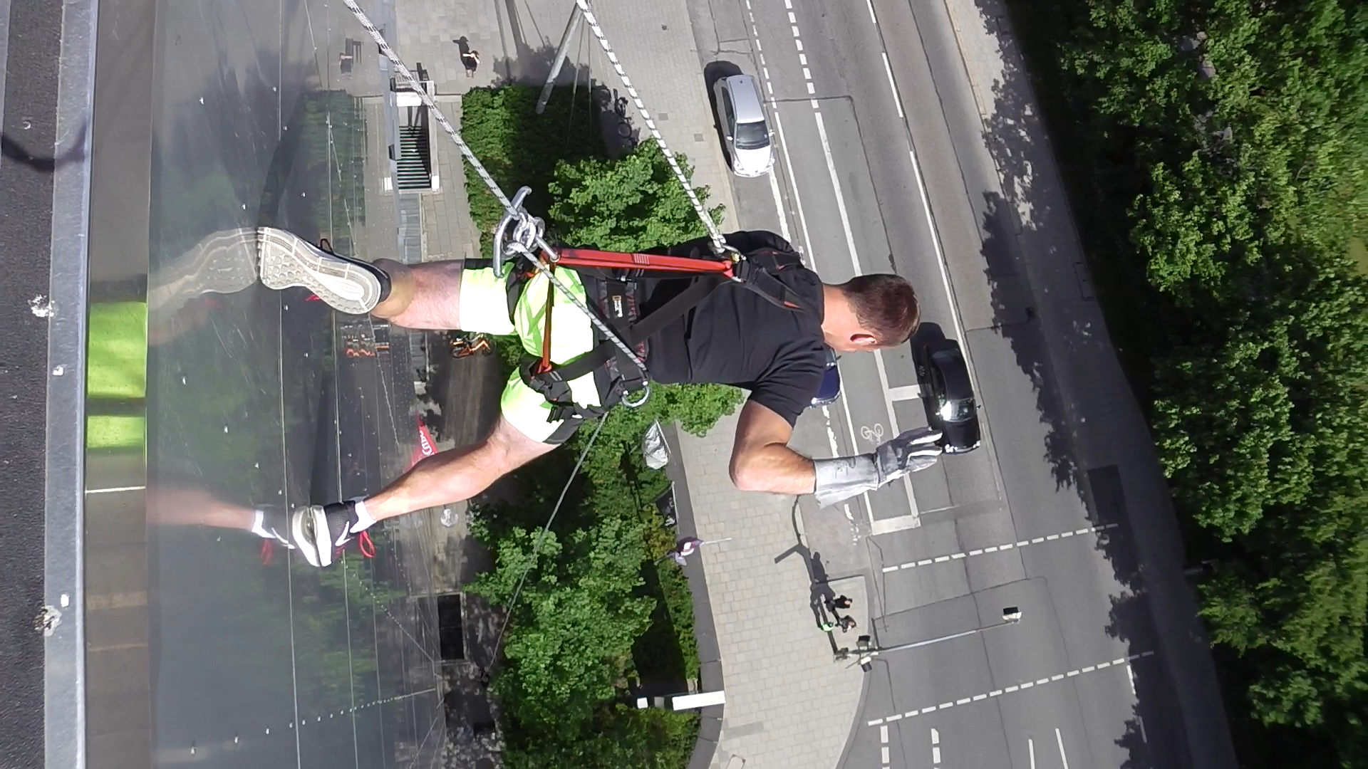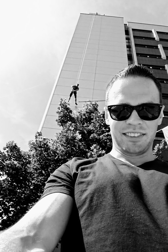 Najstraszniejszy moment to zdecydowanie pierwsze kroki, które stawia się na krawędzi dachu. Mimo że czujesz uprzęż która Cię trzyma, to nie widzisz lin, które od teraz dźwigają Twój ciężar. Na wyobraźnie działa zdecydowanie. Potem już z górki, dosłownie i w przenośni. Można nie tylko iść, ale również odbijać się od ściany i po niej skakać. Przynajmniej mnie, komentarzami z góry do tego zachęcali. Także właściciel hotelu nie powinien mieć pretensji, bo trochę im tę aluminiową? ścianę swoimi kilogramami obiłem. Oczywiście na chodniku pod budynkiem ma się darmową publikę. Część osób zatrzymuje się przypadkiem, a część widowni to znajomi, ponieważ na górę wchodzą tylko uczestnicy.